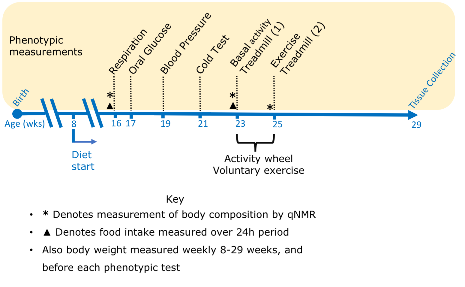 - Food was provided ad libitum during the study, however food intake is measured for individual animals while the mice are placed in the single animal metabolic cages at 16 and 23 weeks respectively. The amount of food available in the feeder is measured at the start and end of a 24h period in order to estimate the individual mouse food intake.